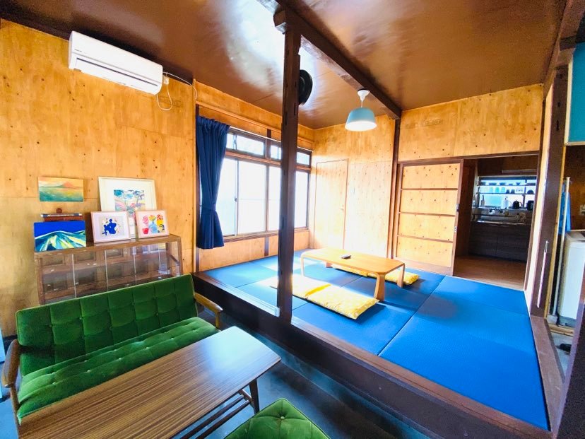 『青とサイダー』は伊豆大島波浮港で生まれ育った私が小さい頃によく遊んだ思い出のこの場所を、新たな思い出をつくれる場所にしようとリノベーションした、アートと自転車のための宿です。
